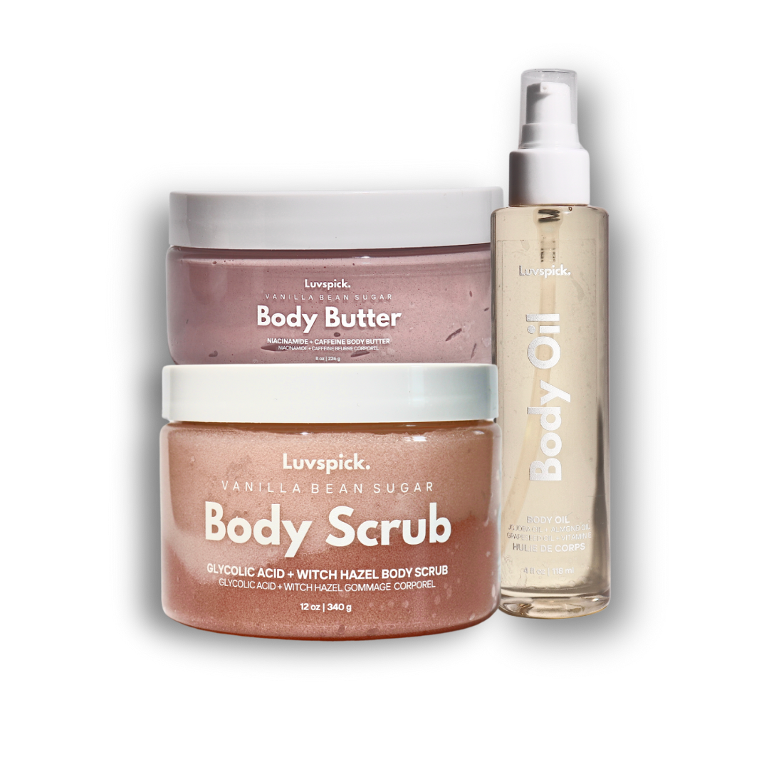 Elevate your self care experience! A warm blend of fresh vanilla beans, rich caramel and soothing cream. Dupe for the famous vanilla bean noel scent. Shop our deliciously scented 5% Niacinamide infused body butter, body oil and Glycolic Acid infused body scrub. Formulated to remove dead skin cells and keep the skin silky smooth. It also helps treat strawberry skin, dry skin, uneven skin tone and tighten the skin.
